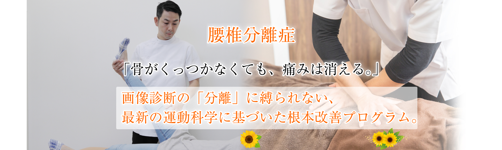腰椎分離症の多くは、成長期の激しいスポーツ活動による疲労骨折の名残りです。いわば『骨の古傷』。古傷があっても、正しくメンテナンスすれば痛みなく動けるのは、膝や肩のケガと同じです。