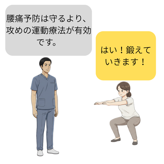 腰が弱い物、守らなければならないものという思い込みから運動恐怖につながり、慢性化させてしまう可能性があります。運動には、腰痛・坐骨神経痛の治療効果と予防効果がありますが、それを遠ざける、避けるために、治らなかったり、再発に繋がっていきます。