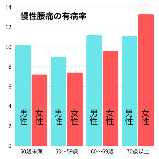 慢性腰痛の有病率に関する世界的な系統的レビューでは、有病率は30代から60歳まで直線的に増加し、女性で一貫して高い率が観察されました。一般成人集団における慢性腰痛有病率は3.9%から20.3%と報告されています。