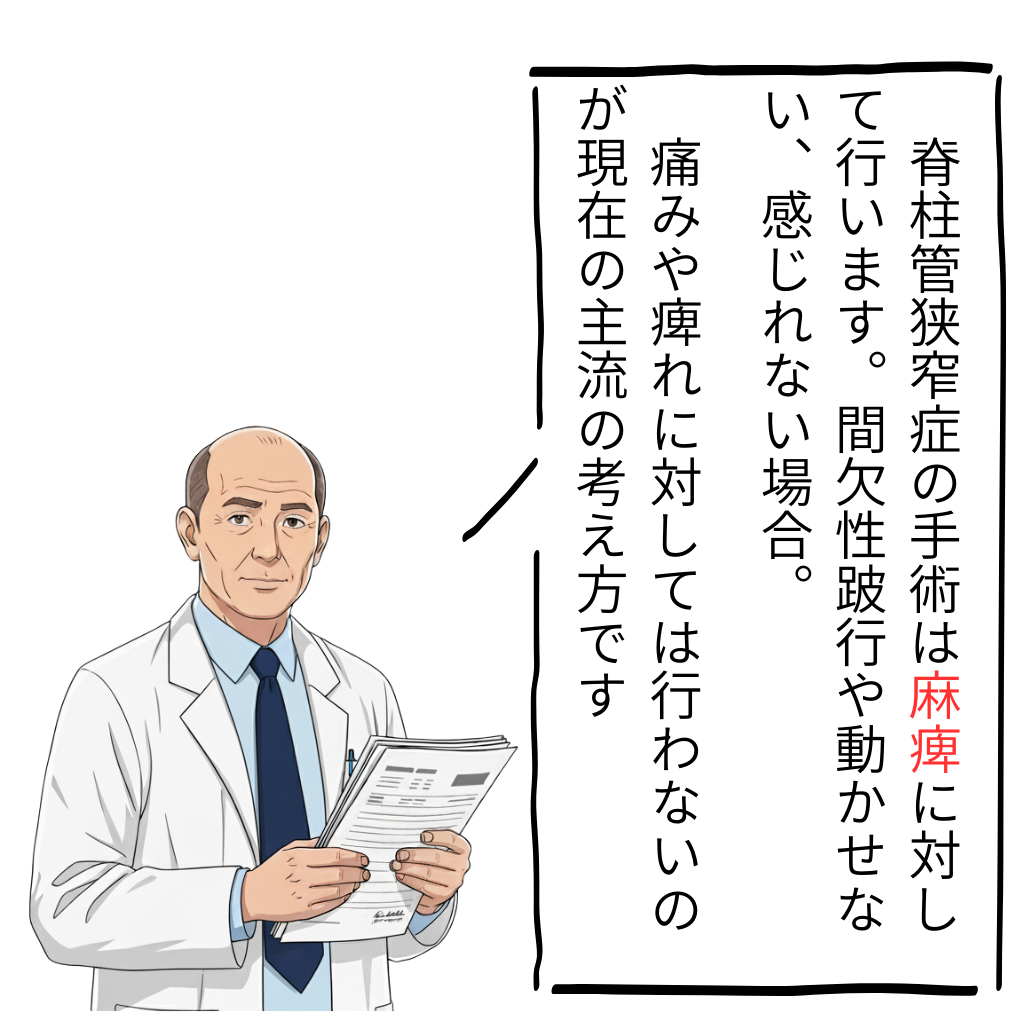 いずれにしろ馬尾症候群の疑いがないのであれば、脊柱管狭窄症だからといって安易に手術すべきではないということです。